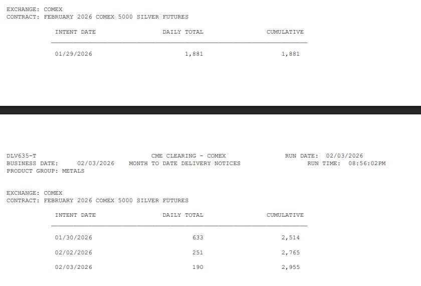 As of February 2, 2026, COMEX February silver contract deliveries show 251 contracts issued and stopped, with month-to-date deliveries reaching 2,765 contracts (approximately 13.8 million ounces). While significantly lower than January’s pace, this still represents material delivery demand in a non-major month.